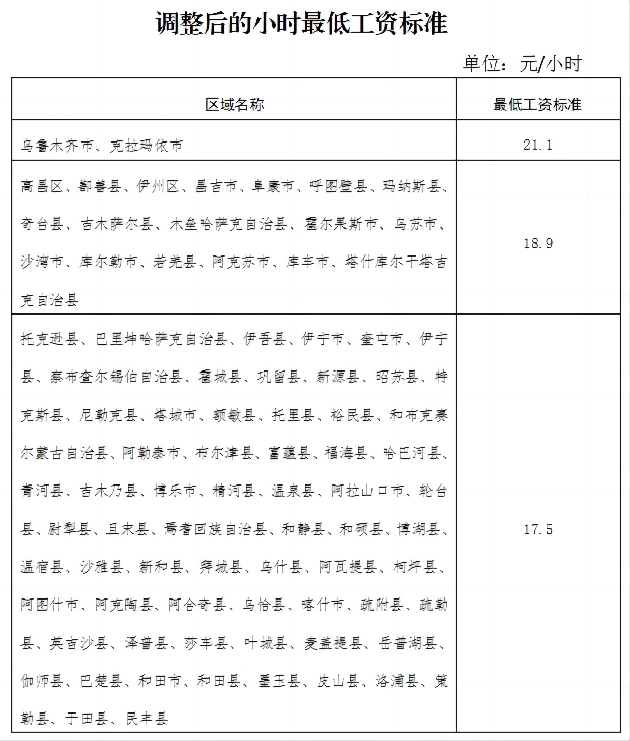 据了解,目前新疆最低工资标准于2021年发布执行。按照《关于调整新疆维吾尔自治区最低工资标准的通知》(新政发〔2021〕21号),全日制就业劳动者月最低工资标准分四个档次,即1900元、1700元、1620元、1540元;非全日制就业劳动者小时最低工资标准依次为19.0元、17.0元、16.2元、15.4元。