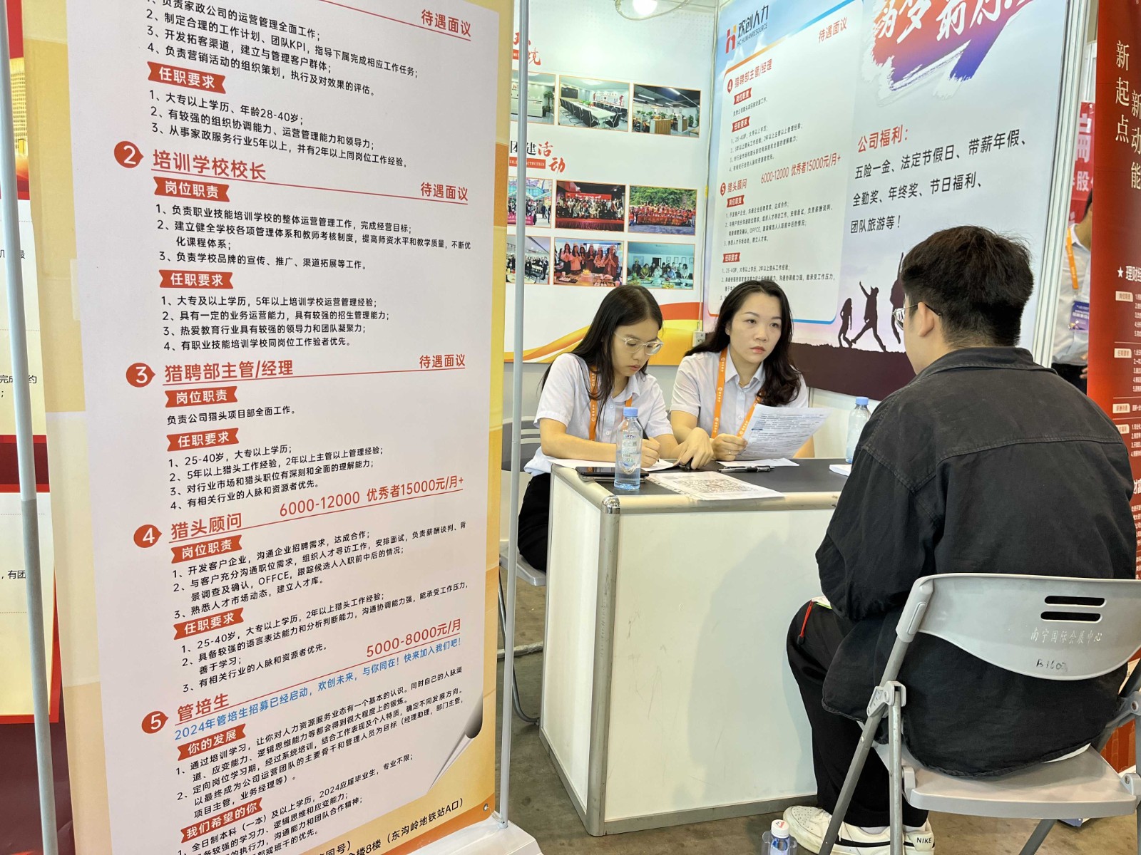 11月4日,在中国—东盟人力资源供需对接会暨全区人才交流大会上,广西欢创人力专设招聘展位。招聘会上,现场热情高涨,前来咨询和面试的求职者络绎不绝。